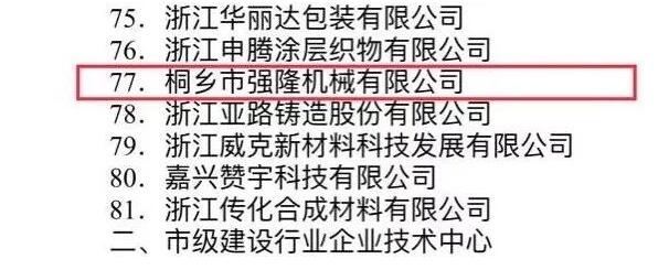 Jiaxing Belediyesi Halk Hükümeti Ofisi, inovasyon odaklı kalkınma stratejisini daha fazla uygulamak için, kurumsal teknolojik inovasyon sistemlerinin inşasını güçlendirmek, teknolojik inovasyon yeteneklerini ve işletmelerin seviyelerini iyileştirmek ve ekonomik dönüşüm ve yükseltmeyi teşvik etmek için açıkça belirtti. Bu nedenle, Jiaxing Belediyesi Halk Hükümeti, 84 işletmeyi 2017 Jiaxing Belediye İşletme Teknoloji Merkezi olarak değerlendirdi. Şirketimiz-Tongxiang Qianglong Machinery Co., Ltd.'nin listede olması bir onurdur.